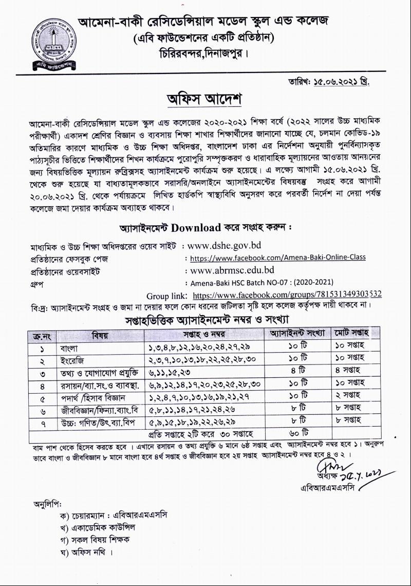 কোভিড-১৯ পরিস্থিতিতে ২০২১ শিক্ষাবর্ষের কলেজ শাখার (এইচ এস সি-২০২২) অনলাইন ক্লাস রুটিন-২০২১