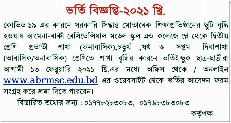 বিস্তারিত তথ্য জানতে ফেসবুক পেইজ Amena Baki Residential Model School and College Official ভিজিট করুন।