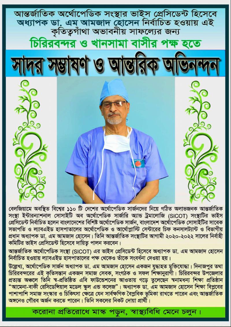 আন্তর্জাতিক অর্থোপেডিক সংস্থা (SICOT) এর ভাইস প্রেসিডেন্ট হিসেবে অধ্যাপক ডা. এম আমজাদ হোসেন নির্বাচিত হওয়ায় ল্যাবএইড হাসপাতালের পক্ষ থেকেও তাঁকে সংবর্ধনা দেওয়া হয়।