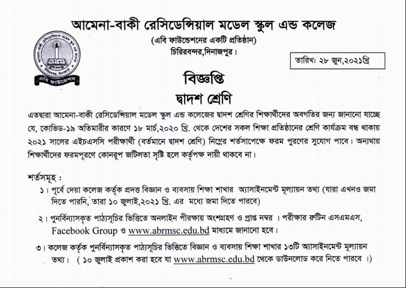 কোভিড-১৯ পরিস্থিতিতে দ্বাদশ শ্রেণি, এইচ এস সি পরীক্ষা-২০২১ এর অ্যাসাইনমেন্ট