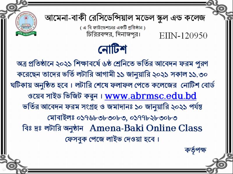 ৬ষ্ঠ শ্রেণির ভর্তি লটারি-২০২১ এর ফলাফল